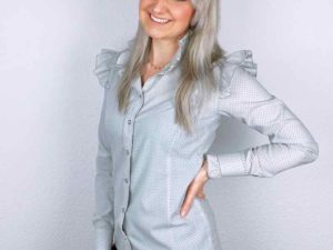 Ein schöner Baumwollstoff, ideal zum Nähen von Bekleidung. Der Stoff fällt sehr schön in sich zusammen, ideal für Kleider und weit schwingende Röcke. Die Punkte sind mit eingewebt. Abbildung Schnittmuster Bluse Ellen, Shirt Erin und Rock Edina.