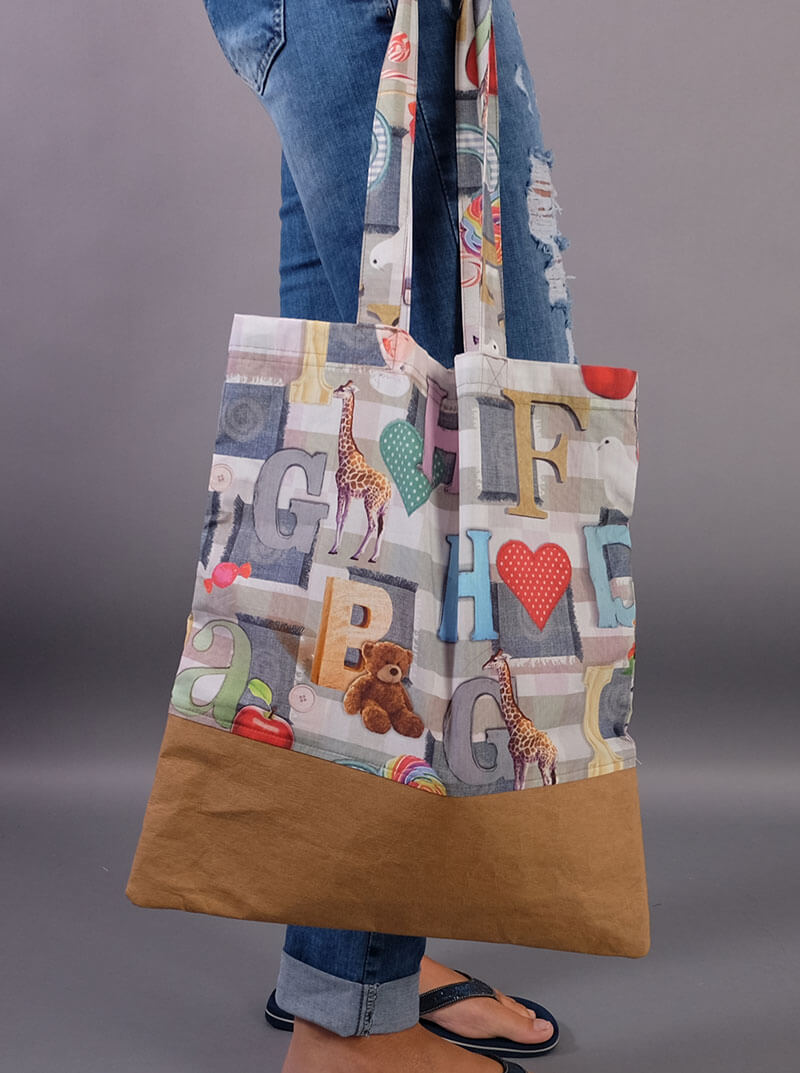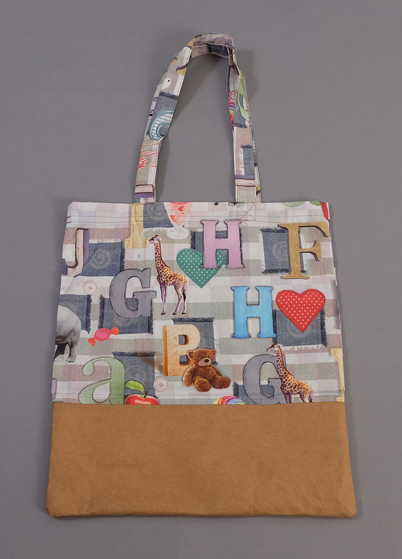 Es sind bei dieser Tasche super viele kreative Gestaltungsmöglichkeiten wie z.B. Patches, Applikationen oder verschiedene Stoffkombinationen möglich. In unserem Beispiel haben wir oben einen leichten Baumwollstoff und unten das angesagte Snap Pap Papier verwendet. Die Träger haben wir selber aus Stoff hergestellt, alternativ könnt Ihr hier aber auch ein gekauftes Band verwenden. Traut Euch hier ruhig ran, diese Tasche ist total einfach und schnell genäht.