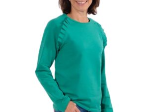 “French Terry” Sweatshirt Stoff aus Baumwolle/Elasthan. Dieser Sweatshirt Stoff ist etwas dicker und als der unifarbene “Single Knit” Jerseystoff. Daher finden wir diese Qualität für Anfänger auch einfacher zu nähen. Du kannst aus diesen Stoff sehr schöne Mützen, Shirts, Kleider, Sweatshirts, Pumphosen und Jogginghosen nähen. Auch für Leggings in der Winterzeit sehr gut geeignet. Der Stoff sieht von außen aus wie ein normaler Jersey, innen ist die typische Schlingenstruktur sichtbar. Abbildung Schnittmuster Rüschen Raglanärmel Shirt Beata und Piet.