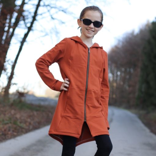 “French Terry” Sweatshirt Stoff aus Baumwolle/Elasthan. Dieser Sweatshirt Stoff ist etwas dicker und als der unifarbene “Single Knit” Jerseystoff. Daher finden wir diese Qualität für Anfänger auch einfacher zu nähen. Du kannst aus diesen Stoff sehr schöne Mützen, Shirts, Kleider, Sweatshirts, Pumphosen und Jogginghosen nähen. Auch für Leggings in der Winterzeit sehr gut geeignet. Der Stoff sieht von außen aus wie ein normaler Jersey, innen ist die typische Schlingenstruktur sichtbar. Abbildung Schnittmuster Jacke Almuth und Rüschen Raglanärmel Shirt Beata.