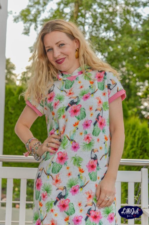 Dies ist ein schönes Hoodiekleid mit raffinierter Taschenlösung, welches durch verschiedene Stoffe immer wieder anders aussehen wird. Dieses Schnittmuster kann auch von Anfängern genäht werden. Ob mit kurzem oder mit langem Arm, als Pullover oder als Kleid, mit oder ohne Taschen…das Schnittmuster ist vielseitig und wandelbar.