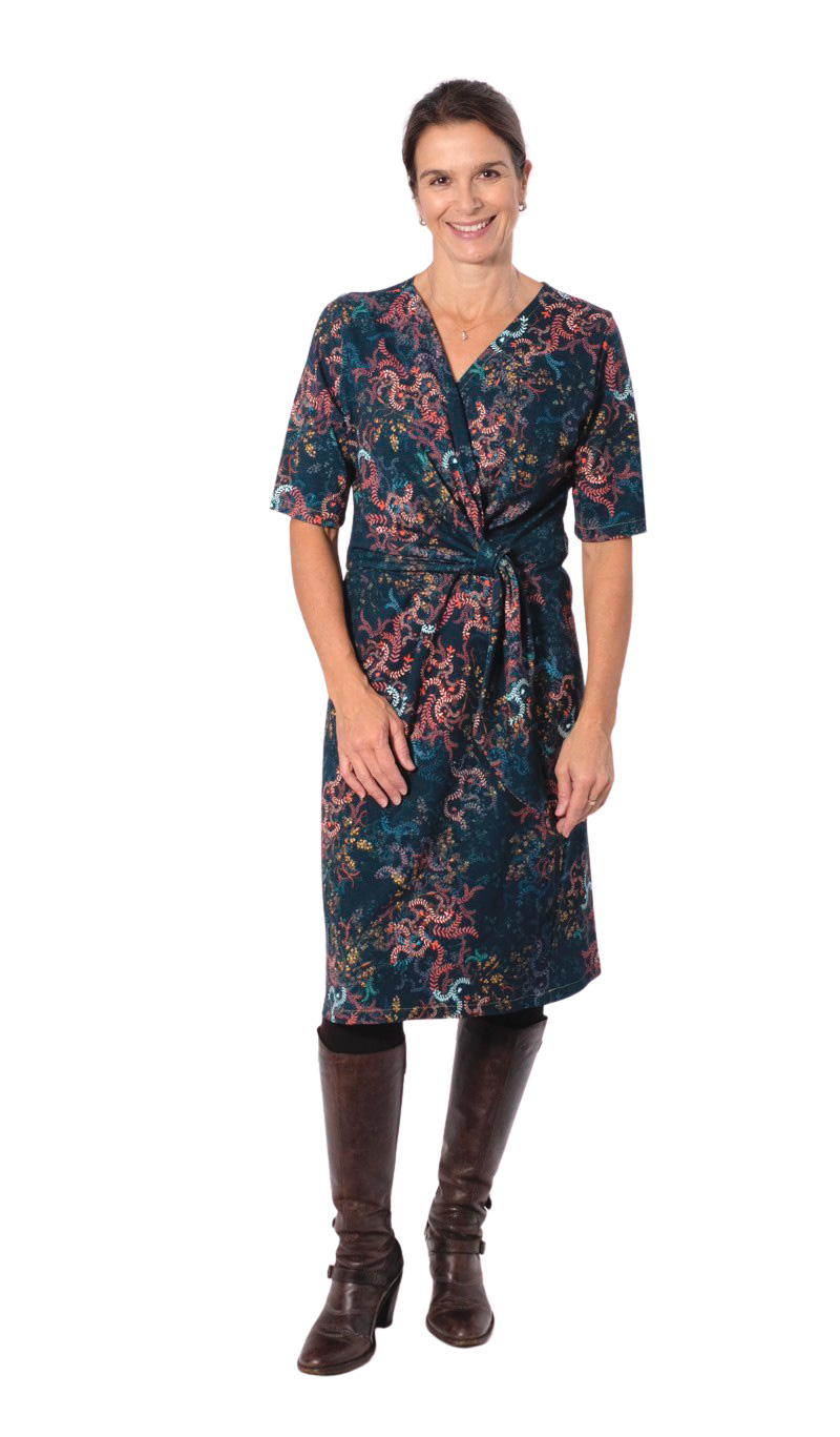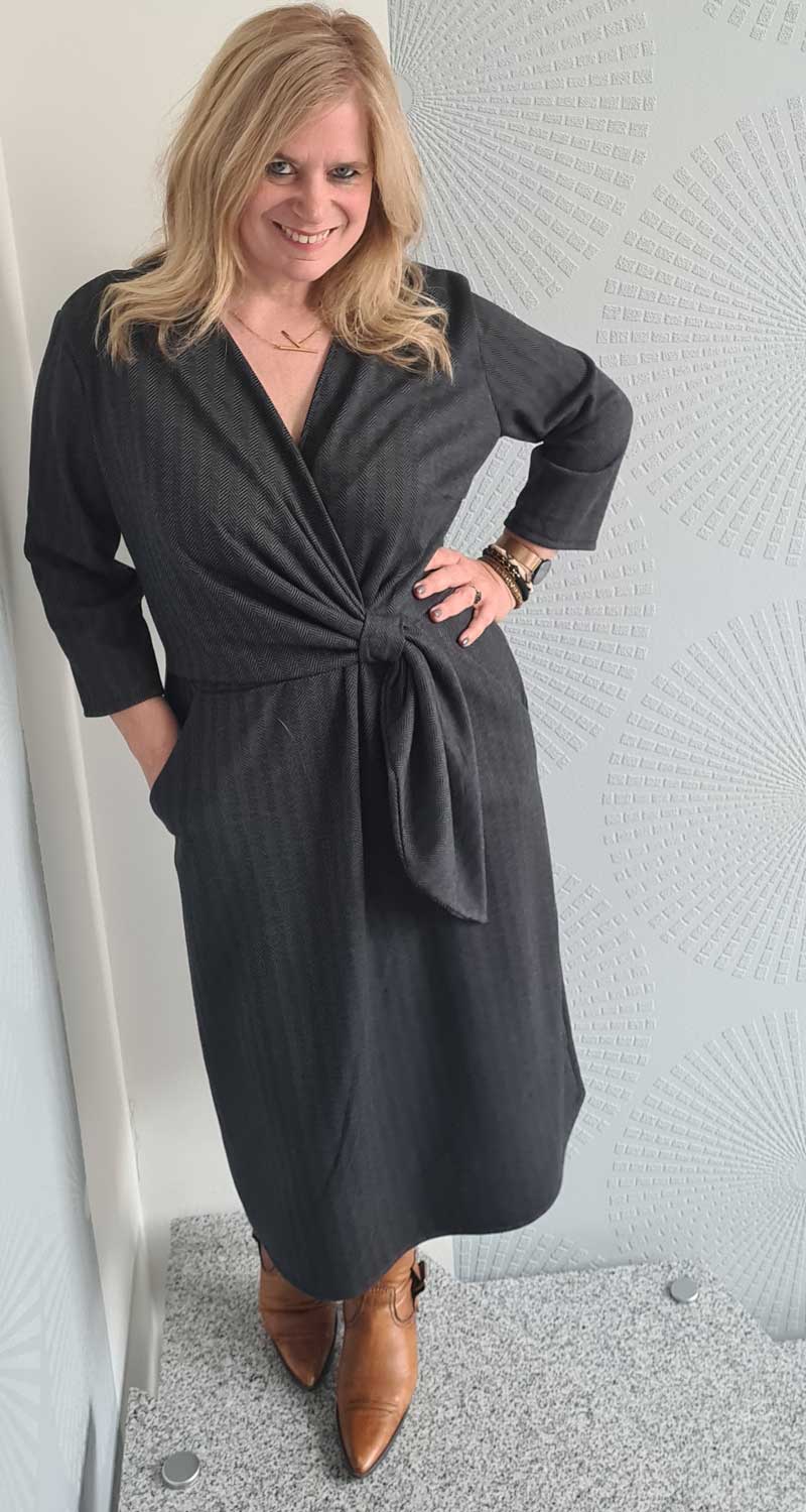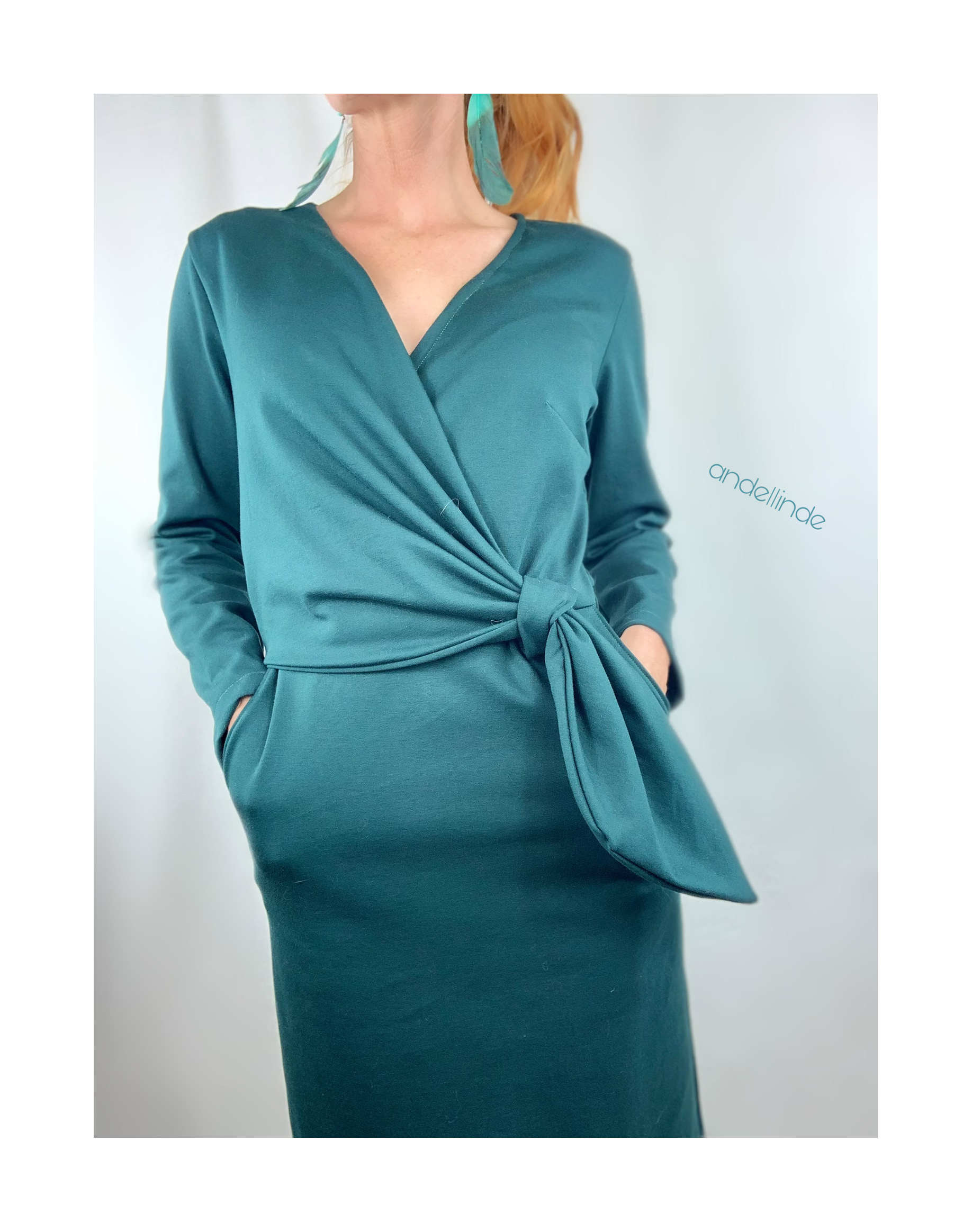 Ein raffiniertes Kleid mit Knoten und Wickeloptik, welches durch die Auswahl des Stoffes immer wieder anders aussehen wird. Das Kleid kannst Du in langer Midi Länge, knielang, mit kurzem oder langem Arm nähen. Das Schnittmuster ist sehr vielseitig und jedes Kleid bekommt durch die Stoffauswahl immer einen neuen Look. Es gibt viele Ideen kreativ zu werden.