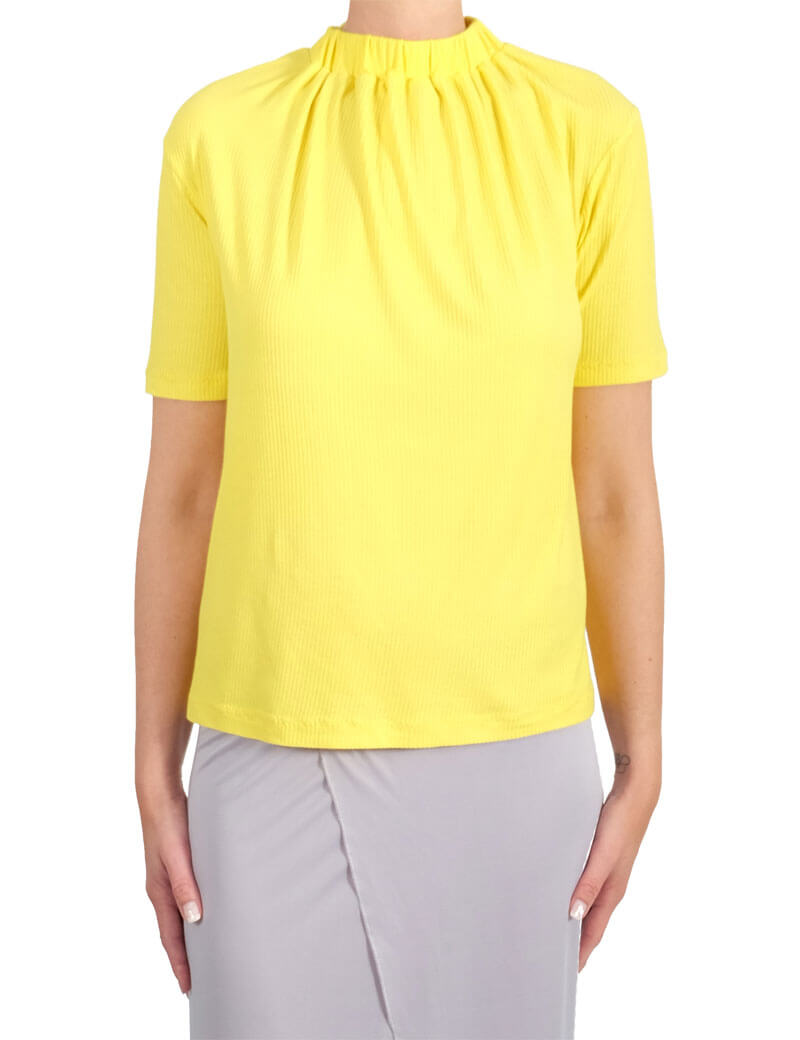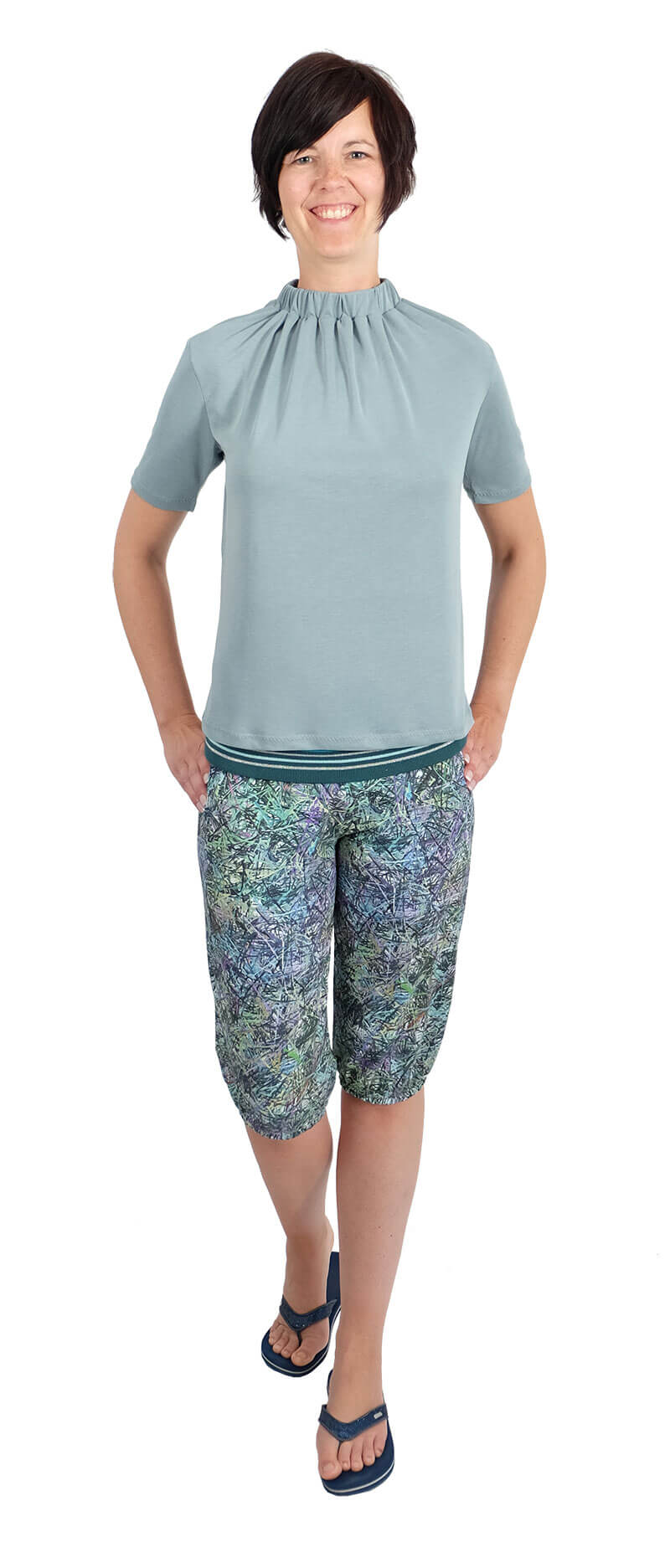 Was für eine coole Kombination! Die Hose “Sunny” mit dem angeschnittenen Beleg hat sich zu einem unserer Favoriten kristallisiert, jeder im Team hat mindestens 1 Hose davon! Hübsch sieht sie in Kombination mit dem Kragenshirt “Nakita” aus! Beide Schnittmuster sind schlicht, haben jedoch das besondere Etwas. Nähanfänger könnten sich an die Hose rantrauen, das Shirt ist nur für Geübte zu empfehlen. Warum? Nicht weil es schwer zu nähen ist sondern weil die Verarbeitung von fließenden Stoffen kniffelig ist. Und das ist hier die Voraussetzung dafür, dass das Shirt so einen hübschen Look und den Fall bekommt. Jerseystoffe aus Baumwolle eignen sich dafür nämlich nicht. Wir haben hier Modaljersey in Mint und Viskosejersey in Gelb verwendet.
