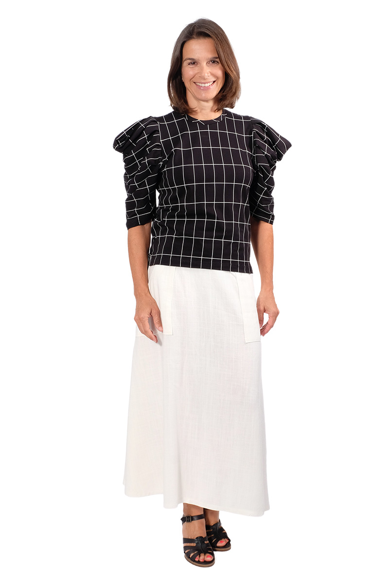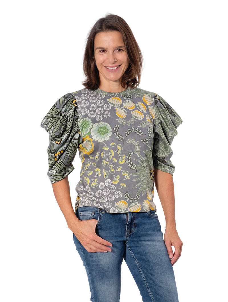 Das Shirt Magdalena ist ein Fashion Statement… es kommt mit 2 verschiedenen Ärmelvarianten daher und Ihr könnt es voluminös oder auch schlicht tragen. Wie Ihr anhand der Bebilderung sehen könnt bekommt es immer wieder einen anderen Look durch die Musterung der Stoffe. Wir empfehlen einen Jerseystoff oder weich fallende Jacqaurd Stoffe….. zu weiche Stoffe wie Viskose Stoffe eignen sich hier nicht da es sonst in sich zusammenfällt. Ein Video von uns gibt es auch noch dazu, damit sollten es auch weniger geübte Näherinnen nachnähen können.)))