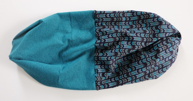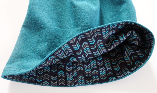 Eine Beanie mit Umschlag wird genauso genäht. Der Unterschied liegt lediglich darin, dass Du die Mütze später umkrempeln kannst und sie daher etwas länger sein muss. Nähe den Umschlag der Beanie aus einem sehr dehnbaren Material, wir emfpehlen Bündchenstoff. Nähe es rechts auf rechts zum Schlauch zusammen. Falte es dann so um, dass die rechten Seiten außen liegen und unten ein Stoffbruch entsteht. Markiere am Bündchen gegenüber der Naht die Stelle mit einer Nadel. Das gleiche machst Du an der Beanie. Jetzt steckst Du das Bündchen auf die Beanie auf. Dabei trifft die Naht der Beanie auf die Naht des Bündchens und die beiden Markierungspunkte auf der gegenüberliegenden Seite liegen auch noch aufeinander. Da das Bündchen etwas schmaler ist als die Beanie muss dieses beim Nähen gedehnt werden. Nähe das ganze mit einem elastischen Stich auf. Und schon ist diese schöne Mütze fertig.