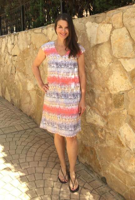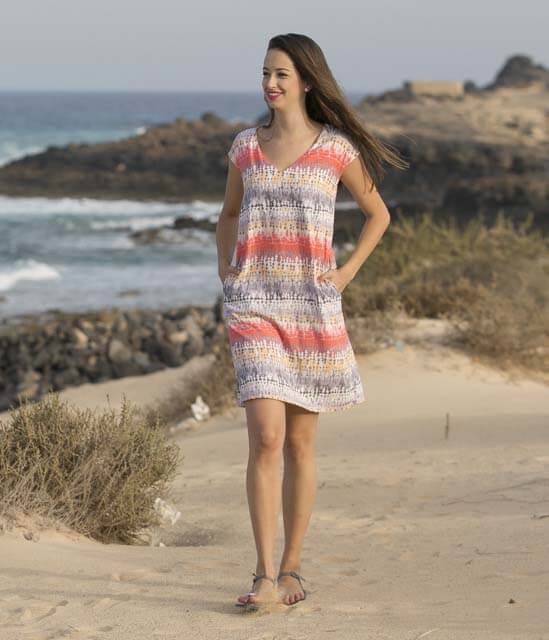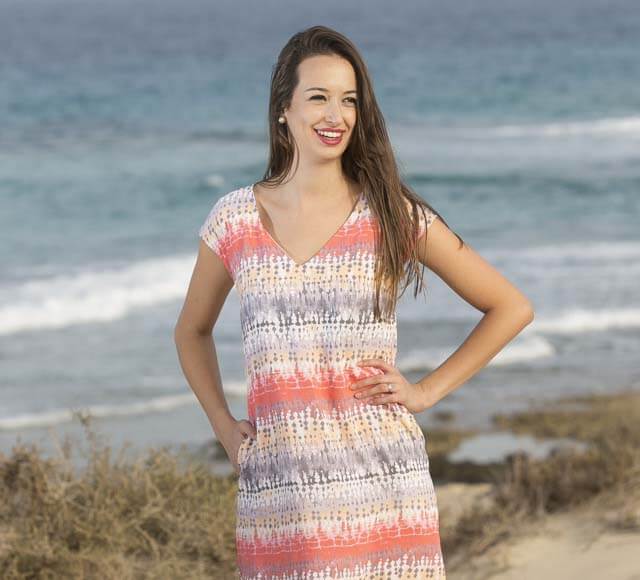 Das Modell Amber ohne Arm und mit überschnittener Schulter ist wohl unser letztes Sommerkleid für diese Saison….-) Dieses leicht taillierte Kleid könnt Ihr grundsätzlich aus allen weich fallenden Stoffen nähen. Ob aus weichen Viskosestoffen oder aus Jersey, es sieht immer gut aus. Das Kleid kann mit Rundhals- oder V-Ausschnitt, mit oder ohne seitliche Taschen verarbeitet werden. Wenn Ihr das Kleid kürzt, dann bekommt Ihr ein unkompliziertes Shirt.