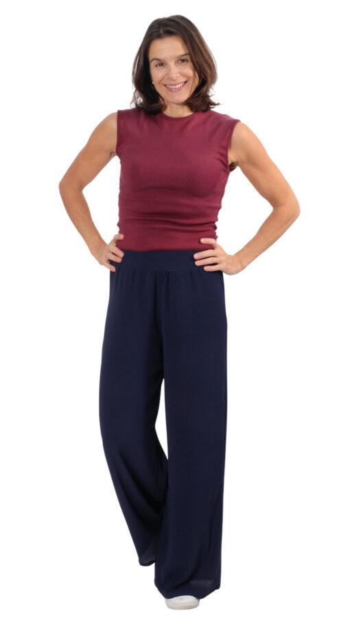 Du möchtest eine lässige, weite Hose nähen? Dann bist Du mit diesem Schnitt richtig…. ob aus Slinky Stoffen, leichten Mischgeweben oder aus Viskosejersey genäht, dieses Modell schaut immer gut aus. Je nach Stoffwahl wird die Hose auch immer wieder einen anderen Look haben. Trau Dich ran, diese Hose wird ohne Reißverschluss und nur mit Gummizug vernäht. wer möchte kann sie auch kürzen und als Culotte tragen…. Auch in der Kombination mit der Bluse Irma oder mit dem Shirt Darya und Anka sieht das toll aus!